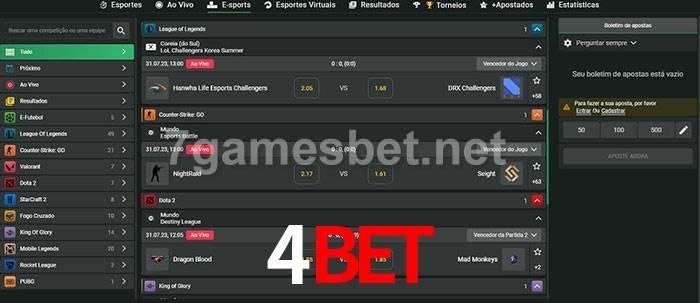 O 4Bet oferece uma grande seleção de opções de apostas em e-sports com probabilidades competitivas
